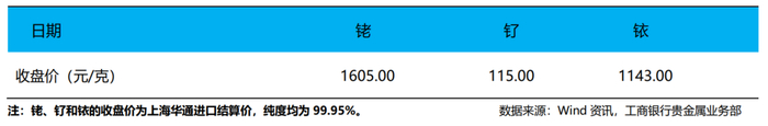 上海华通数据显示,截至6月16日,99.95%现货铑金进口结算价为1605元/克,下降1.23%。99.95%现货钌金进口结算价为115元/克。99.95%现货铱金进口结算价为1143元/克。