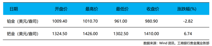 6月12日当周,现货铂金开盘价为1009.4美元/盎司,最高价为1010.7美元/盎司,最低价为961美元/盎司,收盘价为980.9美元/盎司,周累计下跌2.82%。现货钯金开盘价为1324.5美元/盎司,最高价为1426美元/盎司,最低价为1302.5美元/盎司,收盘价为1410美元/盎司,周累计上涨6.74%。