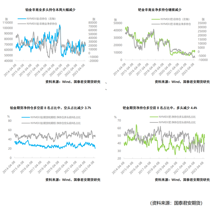 在期货持仓变动方面,截至2023年6月13日,铂金总持仓较上一周增加2314张,其中非商业多头方面减少873张,非商业空头持仓增加1768张,上升幅度达16.7%。非商业净多持仓减少2641张,出现较大幅度下滑,降幅达10.73%。在净持仓多空前8名占比上,铂金方面净持仓多头占比减少2%,空头占比减少3.7%。钯金方面,截至2023年6月13日,总持仓增加1266张,其中非商业多头持仓增加681张,空头增加1215张,非商业净多持仓减少534张,降幅达8.09%。在净持仓多空前8名占比上,钯金方面多头占比减少4.4%,空头占比持续下滑,减少0.9%。