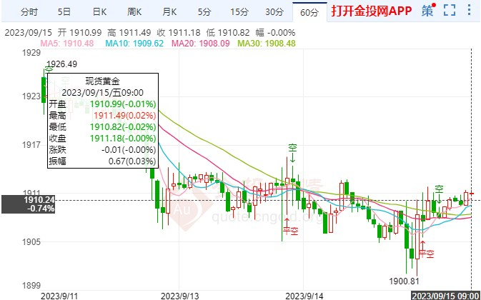 9月15日(周五),黄金盘内保持阳线行情,日内金价区间开启涨势。本交易日,黄金价格区间窄幅拉高走势,北京时间10:27,黄金暂报1914.88美元/盎司。