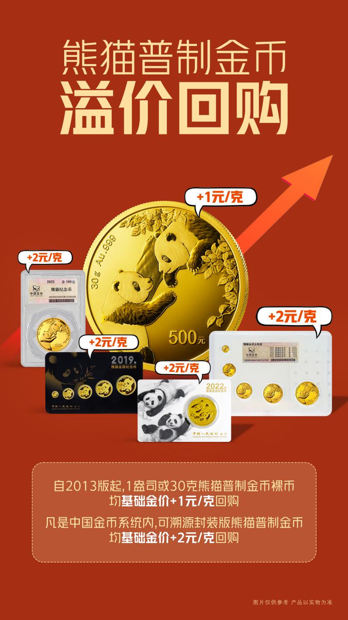 2013版至2015版1盎司熊猫普制金币,2016版起及以后版别的30克熊猫普制金币,上述品种溢价规则为回购基础金价+1元/克。