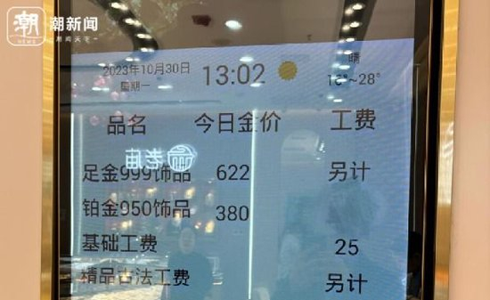 10月30日,潮新闻记者走访杭州多家黄金珠宝品牌发现,多家金店当日足金首饰价格普遍突破620元/克大关,部分品牌甚至已经到了622元/克,创下年内新高。潮宏基、老庙、曼卡龙等品牌柜台销售都告诉记者,目前的零售首饰金价基本为年初至今的最高点。