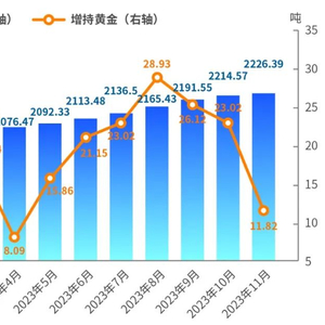 虽然我国的黄金储备有了明显增加,但是无论在绝对量还是相对量都仍然较低。20世纪80年代和90年代,我国的黄金储备不足400吨;2001年、2002年两次增持到600吨,并保持到2009年3月,2009年4月一次性增持454吨;2015年6月一次性增持604吨,此后频繁增持至2019年9月;2022年11月再次启动增持,截至今年11月末已经连续13个月增持合计278.07吨,总量已经达到2226.39吨。