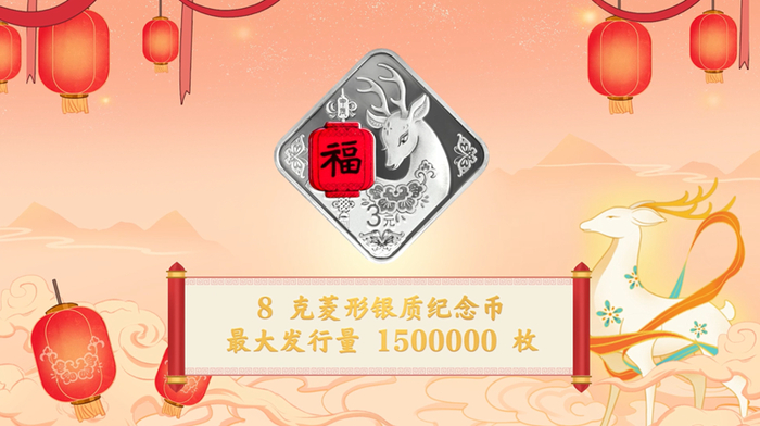 值得一提的是,这个“福”字还与2023年贺岁金银币上的“福”字相同,大有承上启下之意。红灯笼旁边是一只体态匀称的鹿。鹿谐音“禄”,与“福”字相映成趣,寓意“福禄双全”。另外,鹿在传统文化中还是长寿的象征,而它的周围还点缀有蝴蝶纹饰,蝴蝶谐音“福迭”,使得整个币面充斥着满满的祝福。