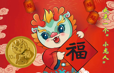 1克圆形金币的背面图案首次采用了身穿龙袍,怀抱“福”字的龙宝宝的卡通形象,将生肖元素融入了其中,带有生肖贺岁、龙年大吉的美好祝福。