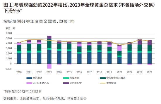 2023年全球黄金总需求下滑5%,全年黄金总供应量同比增加3%