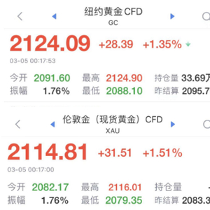 伦敦现货金价3月5日凌晨冲高至2119.79美元/盎司。
