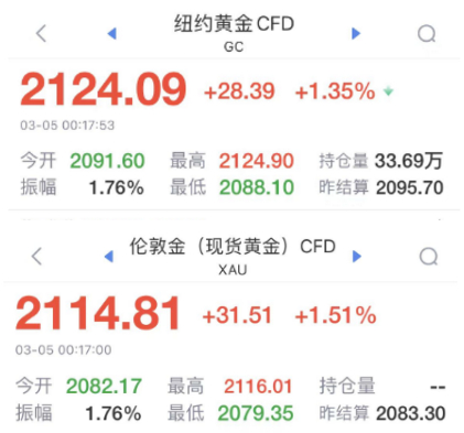 国际金价3月5日凌晨直线拉升
