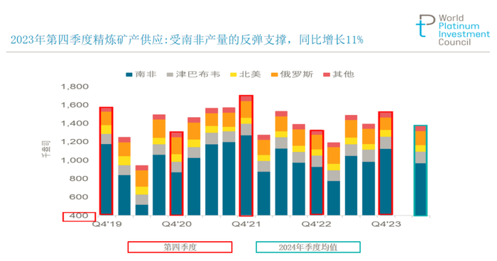 矿山供应方面,2023年第四季度矿产供应达到47.15吨。南非地区的矿山是主要贡献者,该地区的所有精炼厂在该季度均有生产增长。