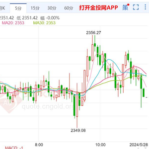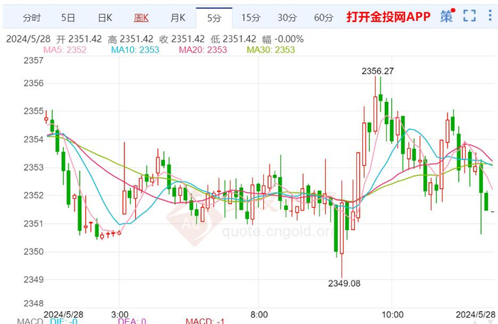 周二(5月28日)本交易日现货黄金日内维持震荡走势,今日开盘报2351.86美元/盎司,最高触及2356.27美元/盎司,最低触及2349.08美元/盎司,截止发稿金价报2351.36美元/盎司,涨幅0.02%。