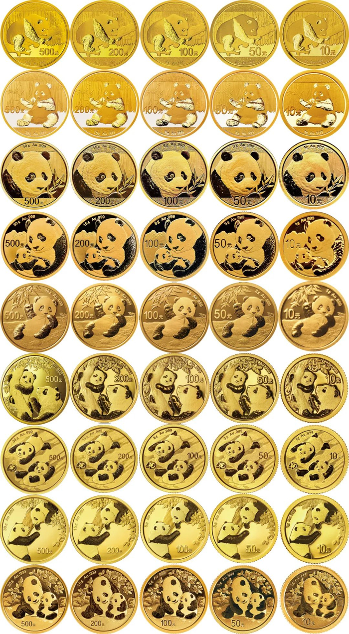 1)2013版及以后年版熊猫普制金币1盎司及30克裸币;
