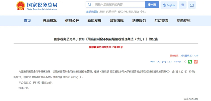 2013年国家税务总局发布《关于发布<熊猫普制金币免征增值税管理办法(试行)>的公告》(2013年第6号),熊猫普制金币成为我国目前唯一免征增值税的实物黄金产品。同年,熊猫普制金币开展回购业务试运行,自此熊猫普制金币回购有法可依。