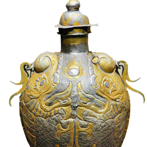 ▲内蒙古赤峰喀喇沁旗哈达沟窖藏出土的摩羯纹金花银提梁壶。 内蒙古博物院藏