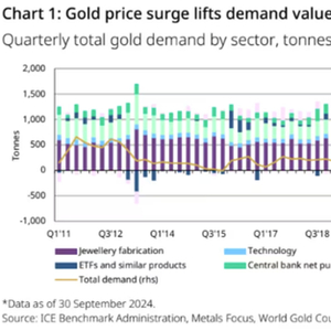 10月30日周三,全球黄金协会(World Gold Council)发布报告称,包括场外交易(OTC)投资在内的黄金总需求量在第三季度同比增长5%,达1313吨;黄金总需求额在第三季度同比增长35%,首次超过1000亿美元。