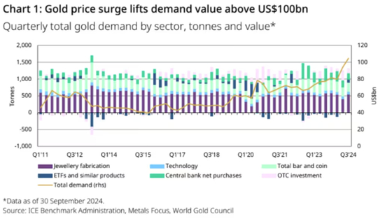 全球黄金需求在第三季度首次突破1000亿美元!