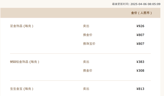 周生生足金饰品标价926元/克,较前一日948元/克的价格下跌22元/克,2天跌32元/克。老庙黄金足金饰品标价931元/克,较前一日946元/克的价格下跌15元/克,2天跌30元/克。周大福足金饰品标价932元/克,较前一日下跌20元/克。