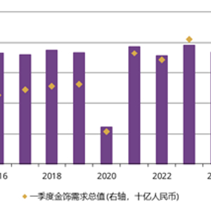 不过在季节性因素的驱动下,一季度中国市场金饰消费较去年四季度仍环比回升18%。得益于需求量吨位的环比回升和金价的显著上涨,金饰消费额环比增幅达29%。