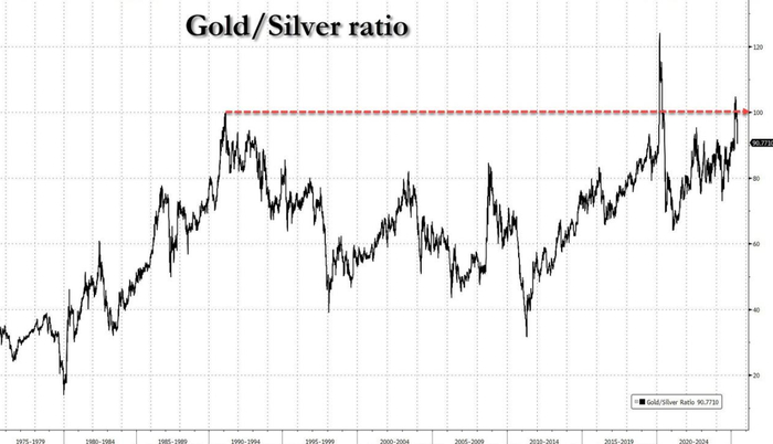 金银比从接近历史高点的100上方(黄金在90年代初和新冠疫情期间的峰值水平)快速回落至90,且仍在加速下跌。