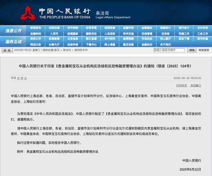 中国人民银行近日发布《贵金属和宝石从业机构反洗钱和反恐怖融资管理办法》(以下简称《办法》),明确贵金属和宝石从业机构的反洗钱义务,要求其建立健全反洗钱内部控制制度,开展客户尽职调查,履行大额交易和可疑交易报告义务,加强洗钱风险管理,并接受自律管理和监管。该办法自2025年8月1日起施行。