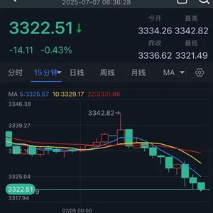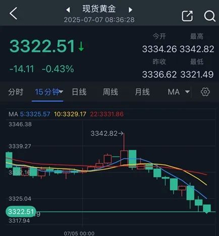 周一(7月7日)亚市早盘,现货黄金突然加速下滑,金价目前跌至3322美元/盎司附近,较稍早触及的日内高点3342.82美元/盎司回落20美元。