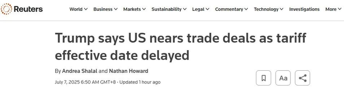 美国总统特朗普当地时间周日最新表示,美国即将在未来几天敲定几项贸易协议,并将在7月9日之前通知其他国家提高关税税率,提高的税率将于8月1日生效。