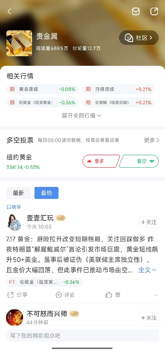新浪财经黄金社区汇聚专业分析师、资深交易员和活跃投资者,日均讨论超万条,形成高价值信息交流圈。