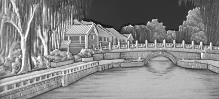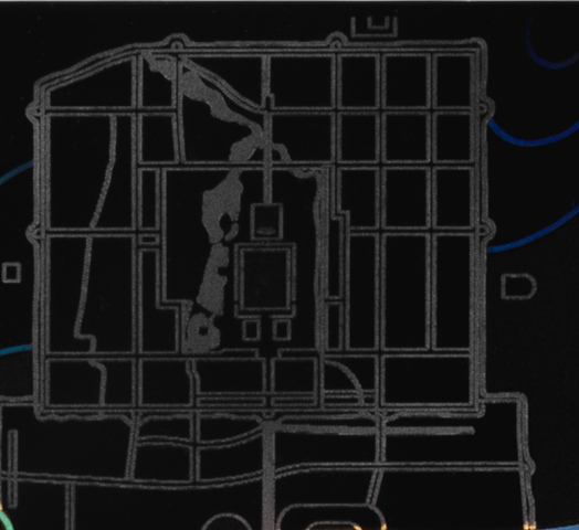 工艺方面,上下两部分的底面为镀黑工艺,燃灯塔和白浮泉这些标志性元素采用镀金工艺,不仅为线描图案增添了金属光泽,更提升了其抗氧化性与耐久性。两处平面图及水纹等装饰,采用了激光雕刻工艺,以微米级精度雕刻出简洁流畅的线条,呈现出一色装裱的古朴雅致质感,象征运河水承载千年文化。