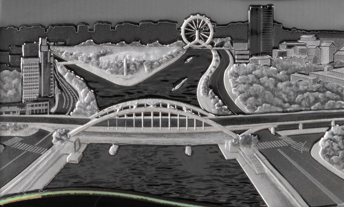 中部三岔河口现代风貌为写实风格刻画,虽为本色,但多层次喷砂和镜面的加持,使得沿河建筑与波光效果对比明显,俨然是实景的完美再现。此外,上下区域分割的河道装饰线条采用光变鳞彩工艺,与币面河水无缝交融,粼粼波光将大运河主题生动体现。