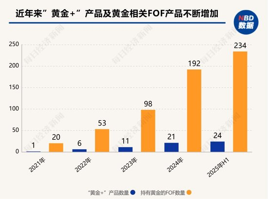 业内数据显示,今年上半年,“黄金+”产品共有24只,其中2只产品的黄金配置比例超过10%。对比来看,去年“黄金+”产品有21只,而2021年只有1只。