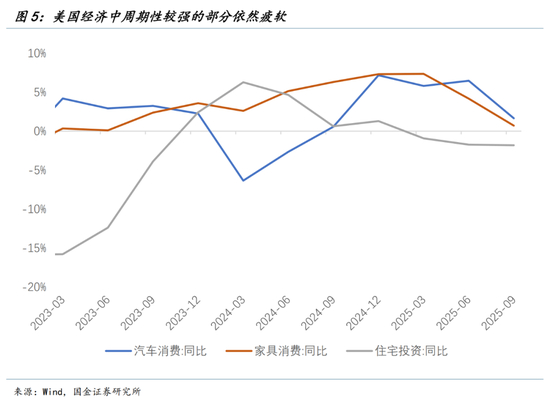 更具周期性,对利率也最敏感的部分——耐用品消费中的汽车与家具消费,投资中的住宅投资的同比增速仍在下行,尤其是在降息近200bp后美国传统的住宅建筑投资仍未见起色,依然十分疲软。这些最应受益于降息的周期性分项反而表现最差,我们依然怀疑降息对于刺激传统实体经济复苏的有效性。