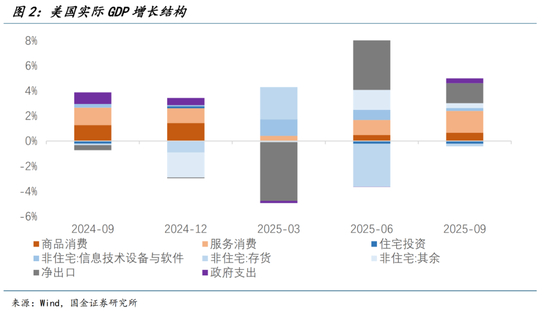 从结构来看,在4.3%的环比折年增速中,居民消费和净出口成为两大支柱,分别贡献2.4和1.6个百分点。然而,消费本身存在分化和“高估”,净出口的增长实际上延续着“抢进口”的余波影响,看似放缓的投资增速中AI与非AI的分化仍在拉大。