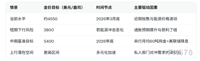 为更直观展示本次高盛预测与当前市场情景的差异,以下是黄金价格关键情景对比表格: