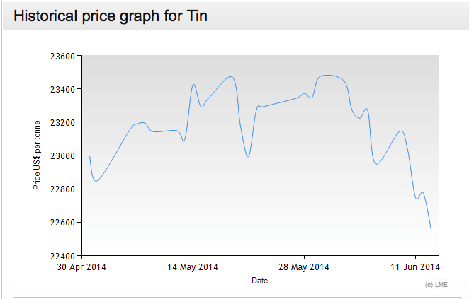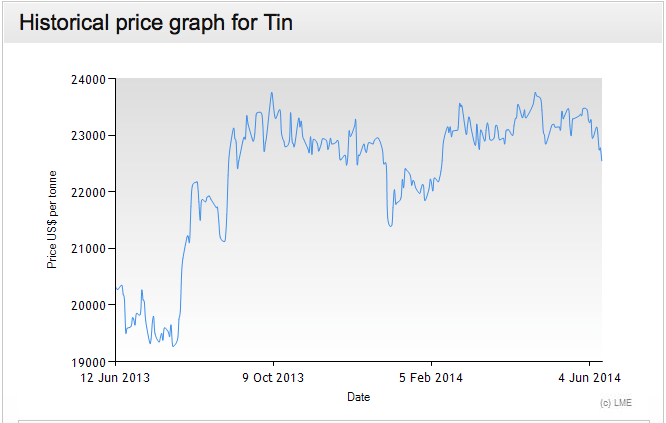 今年早些时候国际锡研究协会(ITRI)预计,受电子行业(主要用作电子原件焊料)需求回升影响,2014年全球锡供应缺口料由7400吨扩大至12400吨。此外,ITRI还预计,供应缺口扩大或导致2014年国际锡均价回升至26000美元/吨,5月LME三个月锡价曾逼近23500美元/吨。