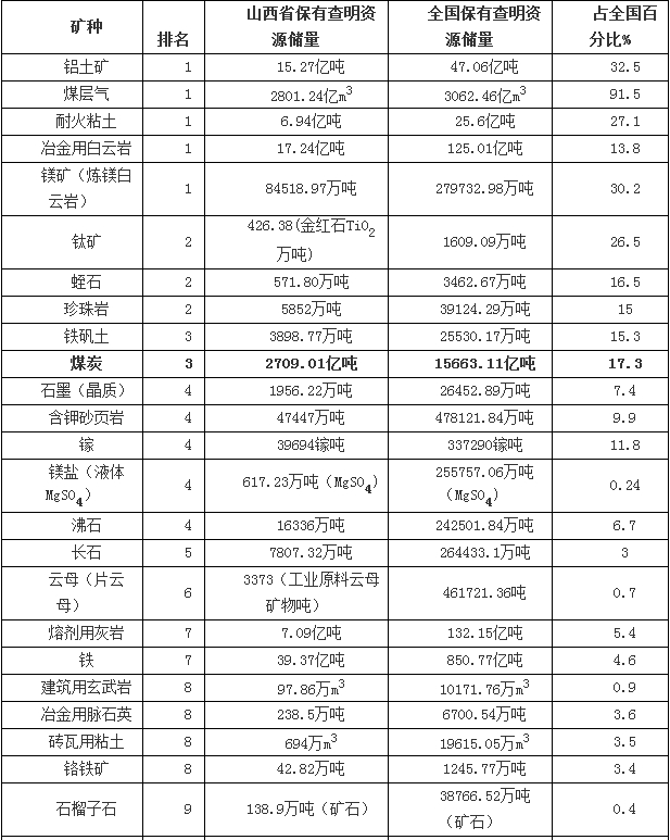 山西省居全国前十位的矿产一览表(截止2015年底)