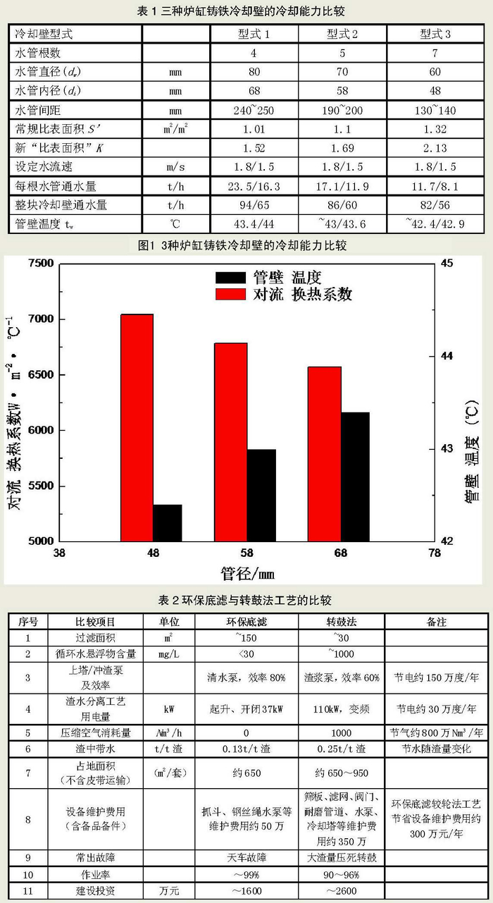 环保底滤技术。环保底滤高炉炉渣处理技术是一种经济、环保、省地的新型炉渣处理新工艺。环保底滤工艺技术有以下特点:一是蒸汽集中排放,无热水池,及时抽干过滤池,实现无水过滤,炉前和过滤区域无蒸汽,环境好。二是过滤池应用渗透过滤工艺,渣水分离彻底,过滤后渣中含水量低于0.12t/t渣,同时,渣池具有暂时储存功能。三是冷水冲渣,抓渣时过滤池内无冲渣水,显著减少蒸汽排放。四是过滤后的循环水中悬浮物含量低于30mg/m3,系统管道、阀门、水泵等几乎无磨损,过滤系统无运转设备,安全性和作业率高。清水泵电能消耗低,节能效果明显。五是过滤池过滤,抓渣采用桥式抓斗起重机,设备少,故障率低,作业安全、可靠。六是通过提高过滤速度,过滤池面积较常规底滤工艺减少一半;总的占地面积和冷水INBA(因巴法)相当,约650㎡(不含皮带)。七是一次性投资及运营成本低。环保底滤与转鼓法工艺的比较见表2。
