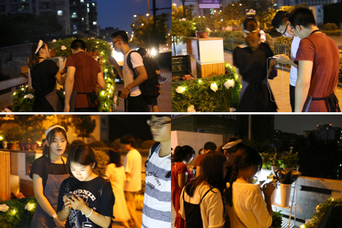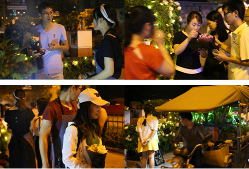 考虑到天气和工作的原因,他们只能在晚上骑着“移动花店”出来卖花,期间有不少路人主动加入。