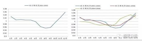 动力煤在2011-2015年区间整体处于熊市周期,2015年是整个宏观悲观预期达到极值点的时候,全年呈现顺畅下跌趋势,2016年则是供给侧改革“276政策”实施的一年,一路上涨。剔除掉这两年,单从现货季节性上观察来看,每年有两个洼点,分别出现在3-5月份及7-9月份;10-12月份,现货价格通常易涨难跌;符合淡旺季的一般经验。