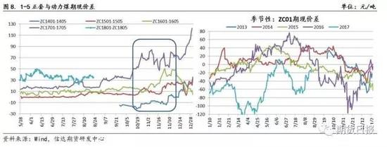 从1-5正套的结构来看,每年进入10月后,旺季驱动带动盘面明显上行。如果附带指标表现为期现价差大、库存低,现货坚挺配合旺季特征将有非常可观的上行收益,如2016年的3-4季度。即便在熊市结构中,从企业行为来说,2011年-2015年为煤炭熊市,价格从年初跌倒年尾,进入四季度后煤企也倾向于提价、为来年价格谈判做准备。
