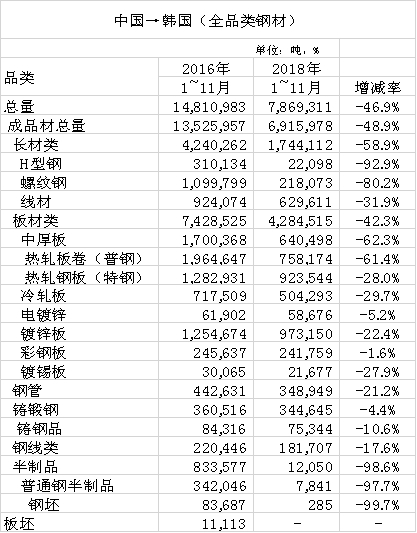 表2:韩国从中国进口各品种钢材分布及对比(单位:吨)