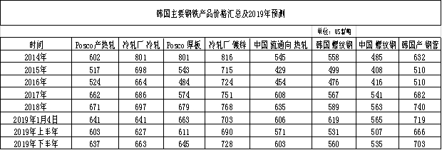 表4:韩国历年主要品种价格汇总及2019年预测 (单位:US$/吨)
