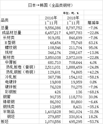 韩国2018年大幅度减少钢材进口量,2018年较2016年从中国进口减少了46.9%,但是从各品种进口量对比中日两大出口国进口量变化来看,由于价格等因素,韩国部分品种已经开始从日本进口,中国出口价格竞争力降低。
