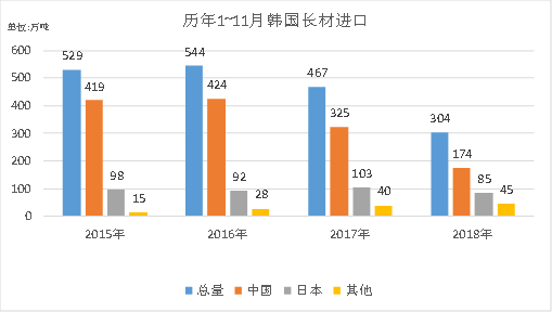 图8:2015-2018年韩国长材进口量(单位:万吨)