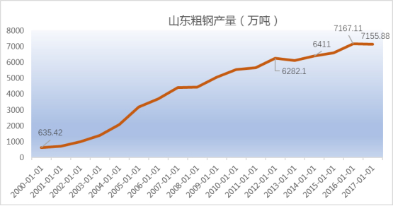 产量方面,国家统计局数据显示,2017年山东粗钢产量为7156万吨,占全国的8%左右。2000年至2017年,山东钢铁产量翻了10倍多,从635万吨大幅增长到7155万吨。不过,2012年后增速明显放缓,部分时段产量有所下滑。