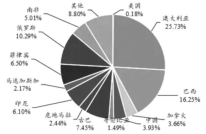 全球镍资源储量十分丰富,镍矿在地壳中的含量约为0.018%。镍矿可分为红土镍矿(氧化镍矿)和硫化镍矿。红土镍矿主要分布在南北回归线以内的热带国家,主要有古巴、巴西、印尼、菲律宾、澳大利亚、新喀里多尼亚、巴布亚新几内亚等;硫化镍矿主要分布在加拿大、俄罗斯、澳大利亚、中国和南非等。