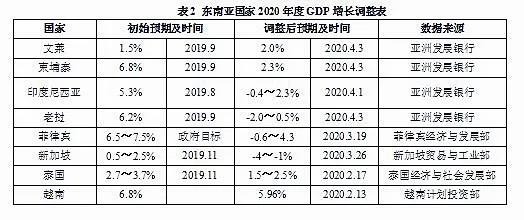 新冠疫情对东南亚国家的经济造成了巨大冲击。受影响最明显的是旅游业、零售业和其他服务行业,商业也面临供应链断裂的危险,就业和正常生活受到威胁,消费者的信心受到沉重打击,为东南亚经济增长前景蒙上了浓重阴影,除文莱外,其他东盟国家针对疫情纷纷下调了2020年度GDP预期(表2)。