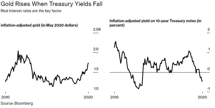 这种关系是有意义的。黄金不支付利息,所以在债券实际收益率很高的时候,黄金没有吸引力。用经济学家的话说,在这种时候持有黄金的机会成本很高。相比之下,在国债收益率为负的情况下,投资黄金看起来相当不错。