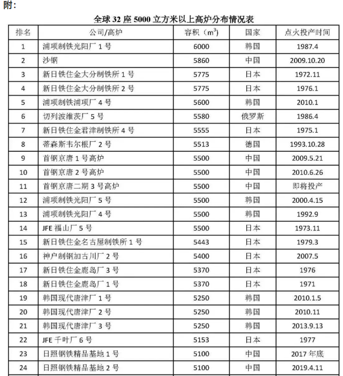 据统计,全球5000m³及以上的高炉将达到32座,其中,中国四大钢厂——沙钢、首钢、山钢、宝钢——独占9座!