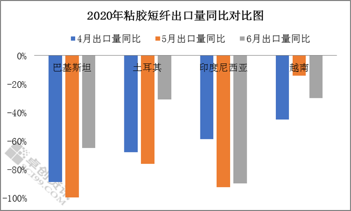 二季度粘胶短纤出口产销国中,巴基斯坦、土耳其、印度尼西亚及越南,出口量同比均出现不同程度下滑,巴基斯坦4月及5月同比减量分别为89%、99%,土耳其分别为68%、76%,印度尼西亚5月及6月减量约92%、90%,越南4月减量约45%,6月约30%。