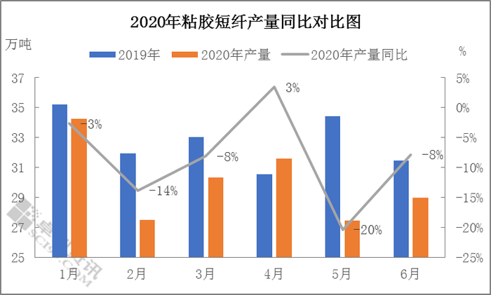 【导语】2020年突发公共卫生事件,终端市场需求受阻;需求弱势,2020年上半年粘胶短纤产量同比减量约8%,在海外公共卫生事件不断扩散影响下,二季度出口量同比出现明显下滑。