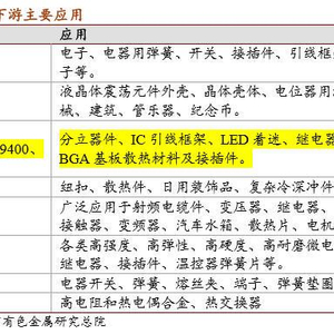 1.铜板带是铜加工行业壁垒最高的领域。连接器作为铜板带的重要下游,对板带材的消耗量较大。引线框架作为集成线路的芯片载体,也属于连接器。它借助于键合材料实现芯片内部电路引出端与外连线的电气连接,起到和外部导线连接的桥梁作用。引线框架与制作和封装应用需求,除高强度、高导热性外,还要求较好的钎焊性、冲压性、蚀刻性和氧化膜粒粘连性等。常选用铜-铁系、铜镍硅系C70250等制作。